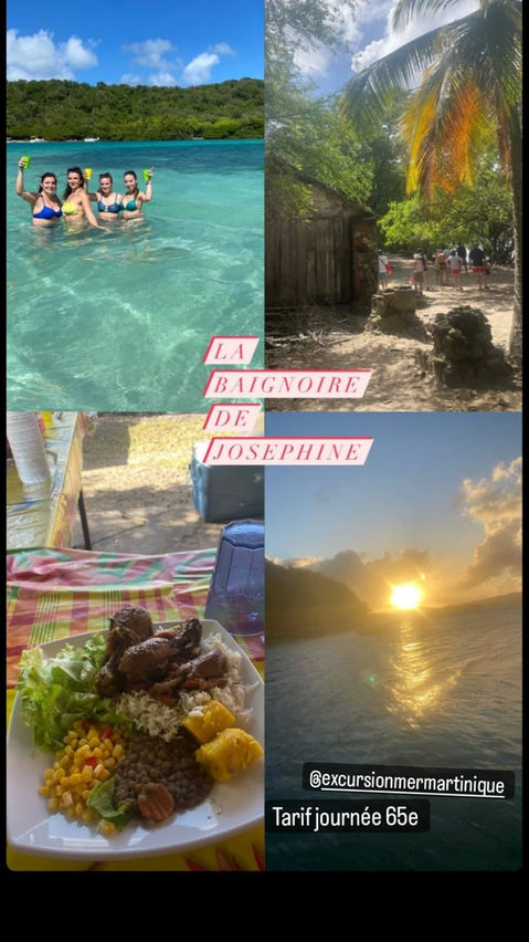 Visite commentée des 8 îlets du François à découvrir. Pensez à amener votre masque et tubas pour admirer les fonds coralliens, poissons et langoustes.Puis direction la Baignoire de Joséphine située entre l’ilet Oscar et l’ilet Thierry. Ce fond blanc d’eau turquoise est unique au monde (baptême du rhum, ti-punch, cocktail de fruits, planteur, rhum arrangé, mises en bouches, accras). La balade continue, cap vers les ilets du Robert – dont l’îlet Loup Garou – une réserve naturelle et un site de ponte des tortues situé à la limite du grand bleu. Navigation le long de la barrière de corail au gré du vent et direction l’îlet Chancel pour y découvrir sa réserve d’iguanes, ses ruines et son patrimoine historique…Nouvel arrêt à la baignoire du Trapèze, petit lagon d’eau turquoise pour un apéro avant de jeter l’ancre dans un fond blanc de l’ilet Madame. La table est dressée, le repas créole se prend à bord entre deux plongeons… Il ne vous reste plus qu’à profiter de votre après-midi le long des plages de sable blanc et d’eau limpide.